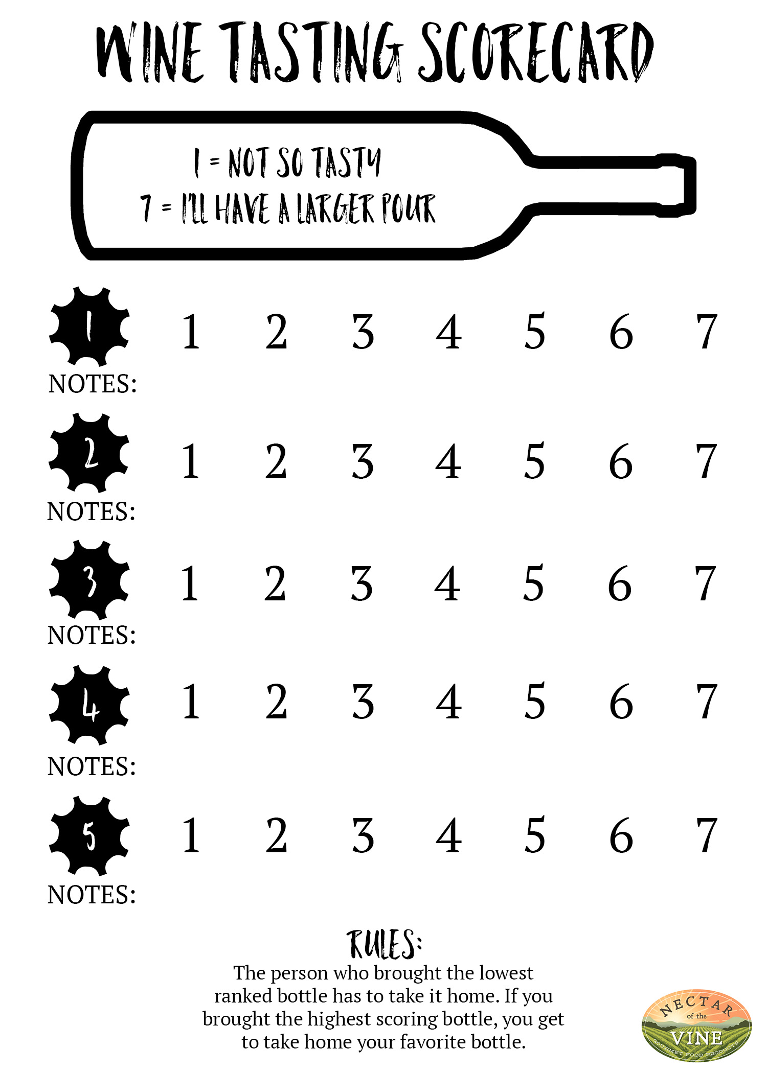 - scorecards - There are plenty of templates to print off online or you can make your own! This will allow the guests to rate each wine based on a scale or on aroma, appearance, flavor, character, and aftertaste. *(We shared with you a scorecard below! Just save the image and print off to use.)